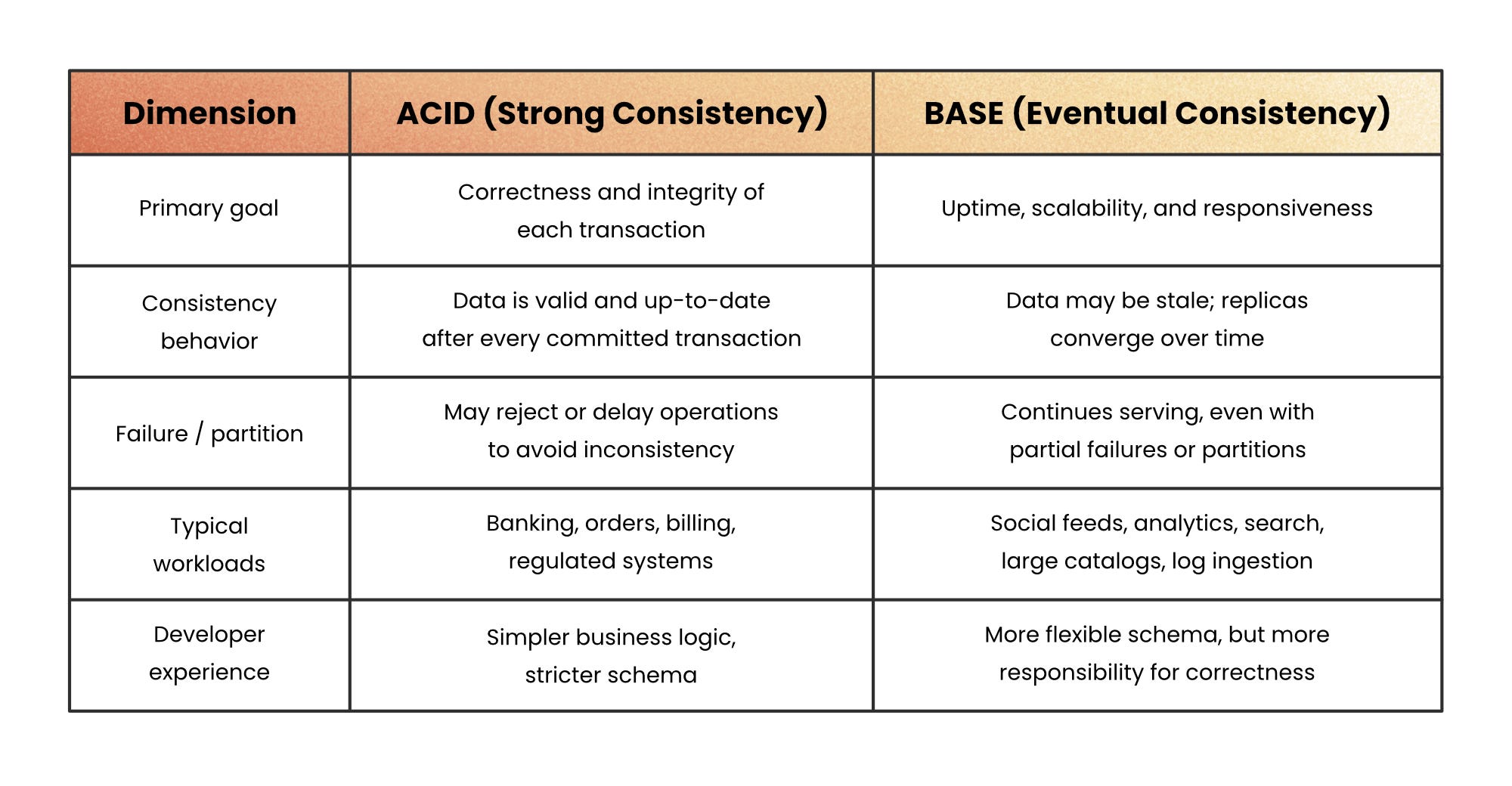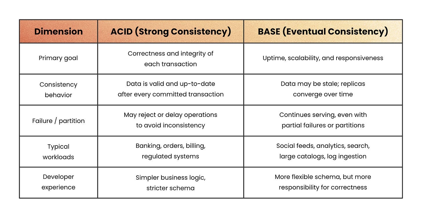 A common pattern is to keep a small ACID core for operations that must always be correct, and use BASE layers to serve that data quickly across regions. The core keeps the truth safe; the edge keeps the system fast and available. If the data can’t be wrong, use ACID. If it can lag slightly or be rebuilt, use BASE.