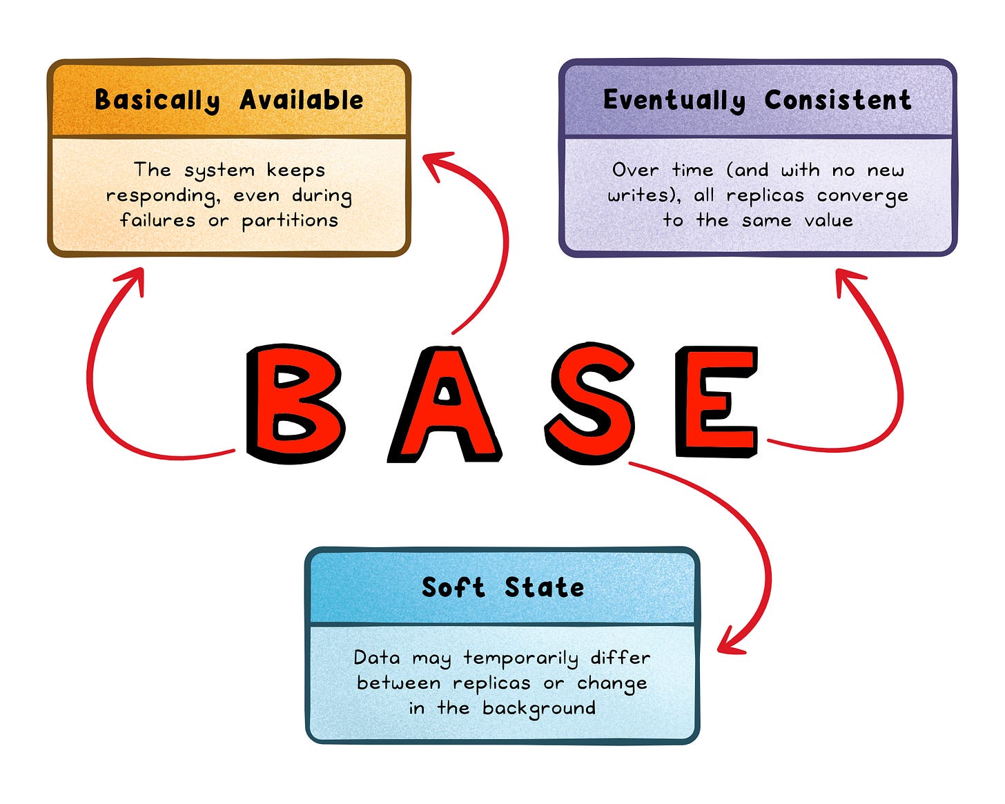 BASE → Favors availability and scale, even if it means serving temporarily inconsistent data.