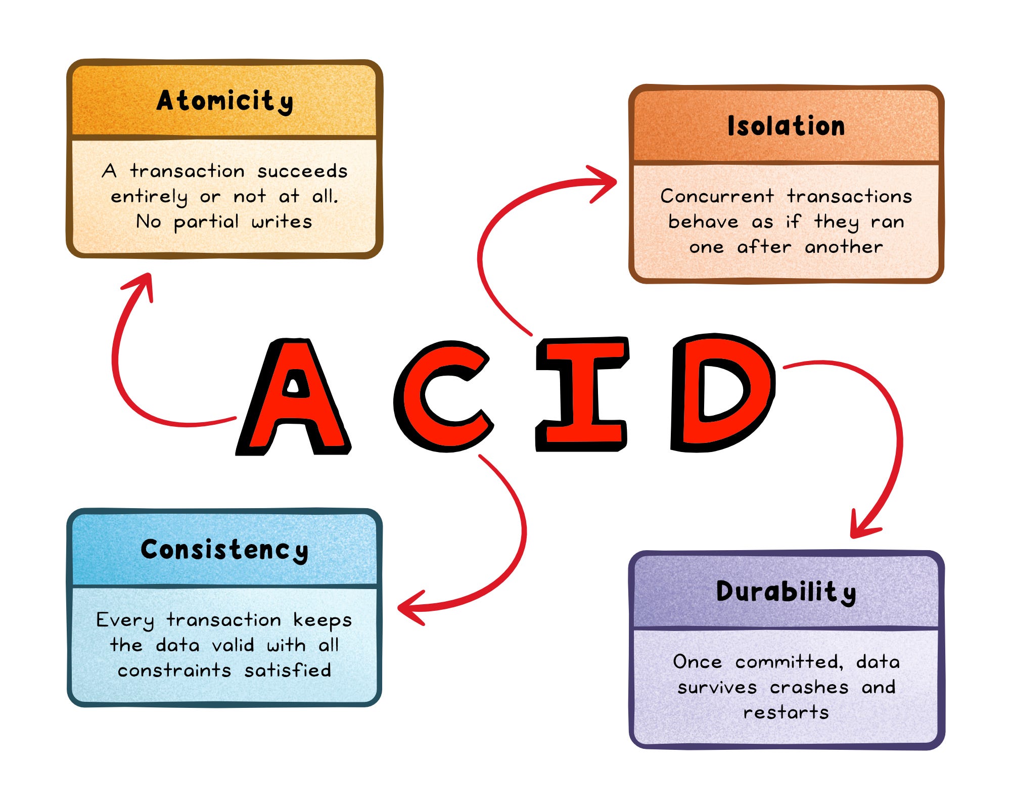 Think of a bank transfer: debit one account, credit another. In an ACID system, either both balance updates land or neither does. There is no state where money disappears or duplicates.