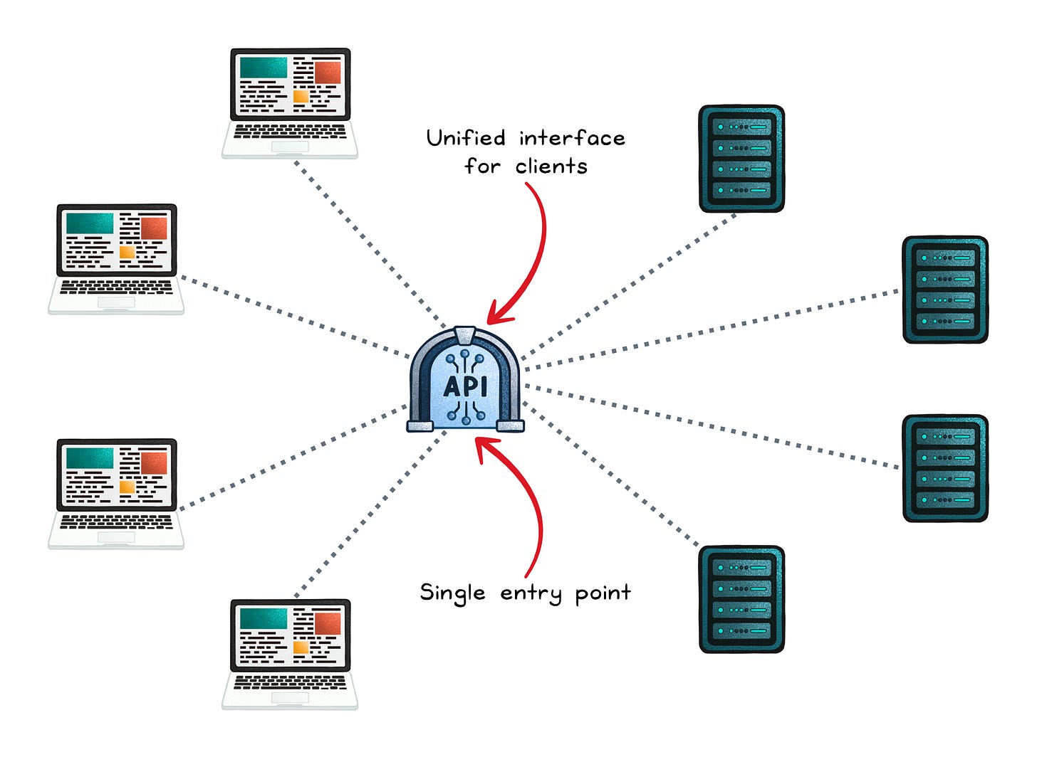 An API gateway does that and checks your badge, enforces rules, and sometimes translates what you asked for into what the building understands.
