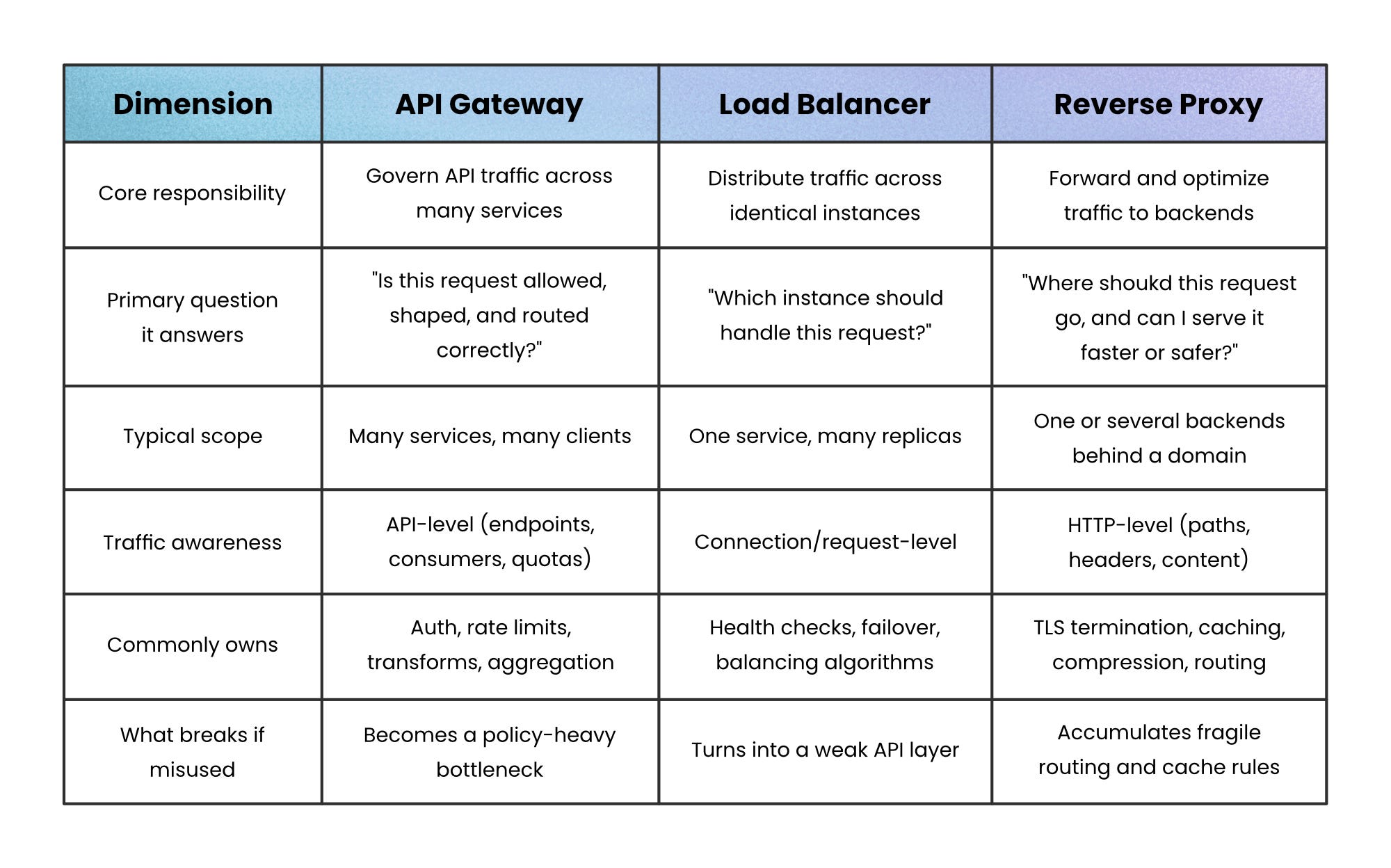 Larger systems often layer them deliberately: a gateway for API policy, a load balancer for instance-level distribution, and reverse proxies where caching or TLS termination reduce pressure downstream.