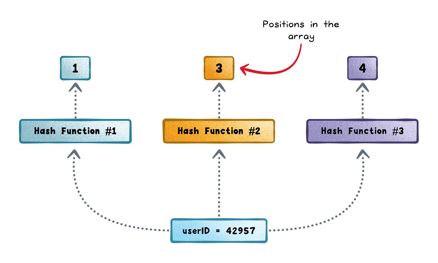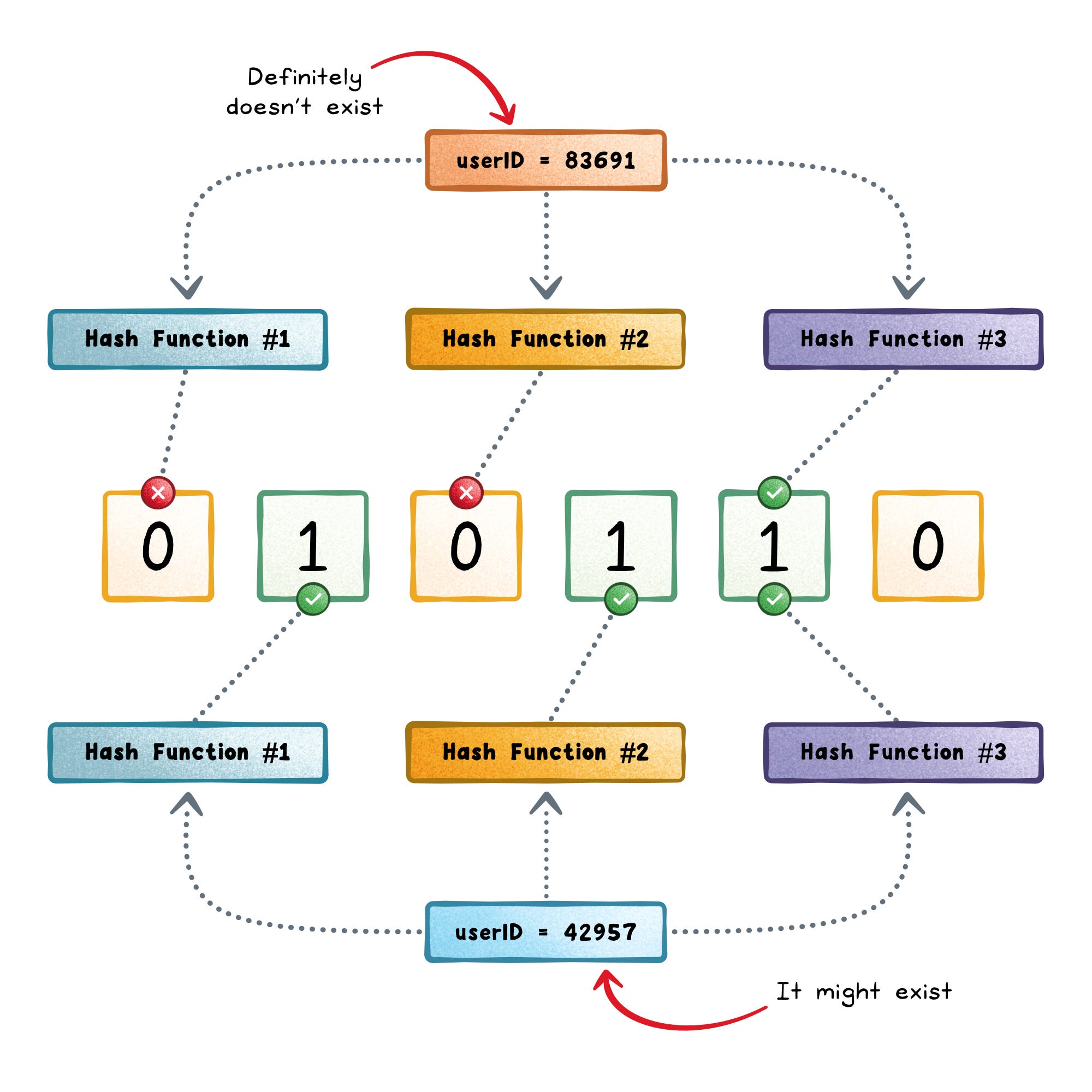 When you check if something exists, you hash it again across all hash functions and see which bits it maps to.If any of those bits are 0 → the item definitely doesn’t exist.