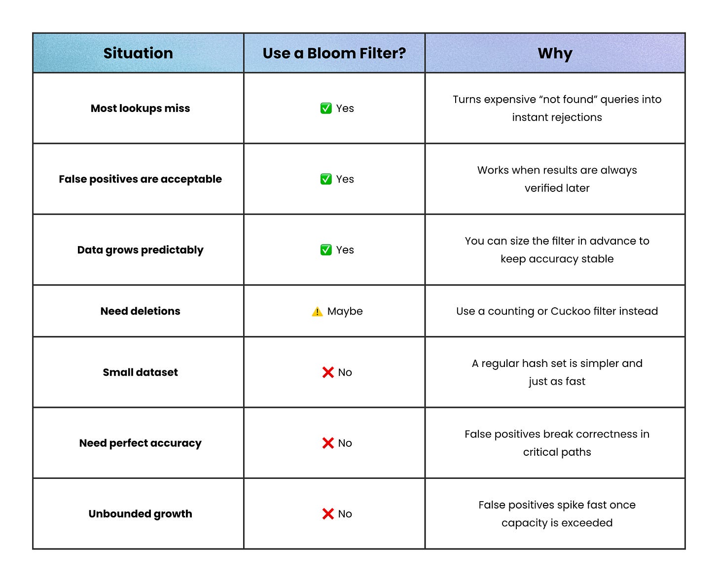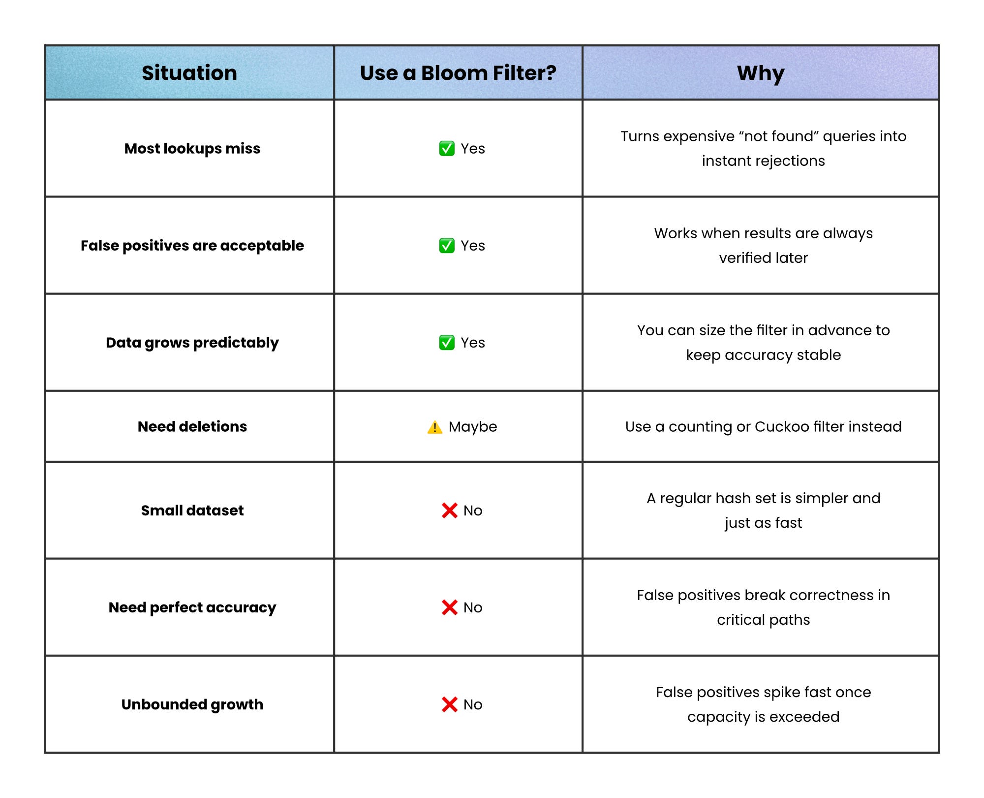 They work best when most lookups miss and precision doesn’t matter. When the cost of being wrong outweighs the savings, the same trick that speeds you up can quietly hurt you.