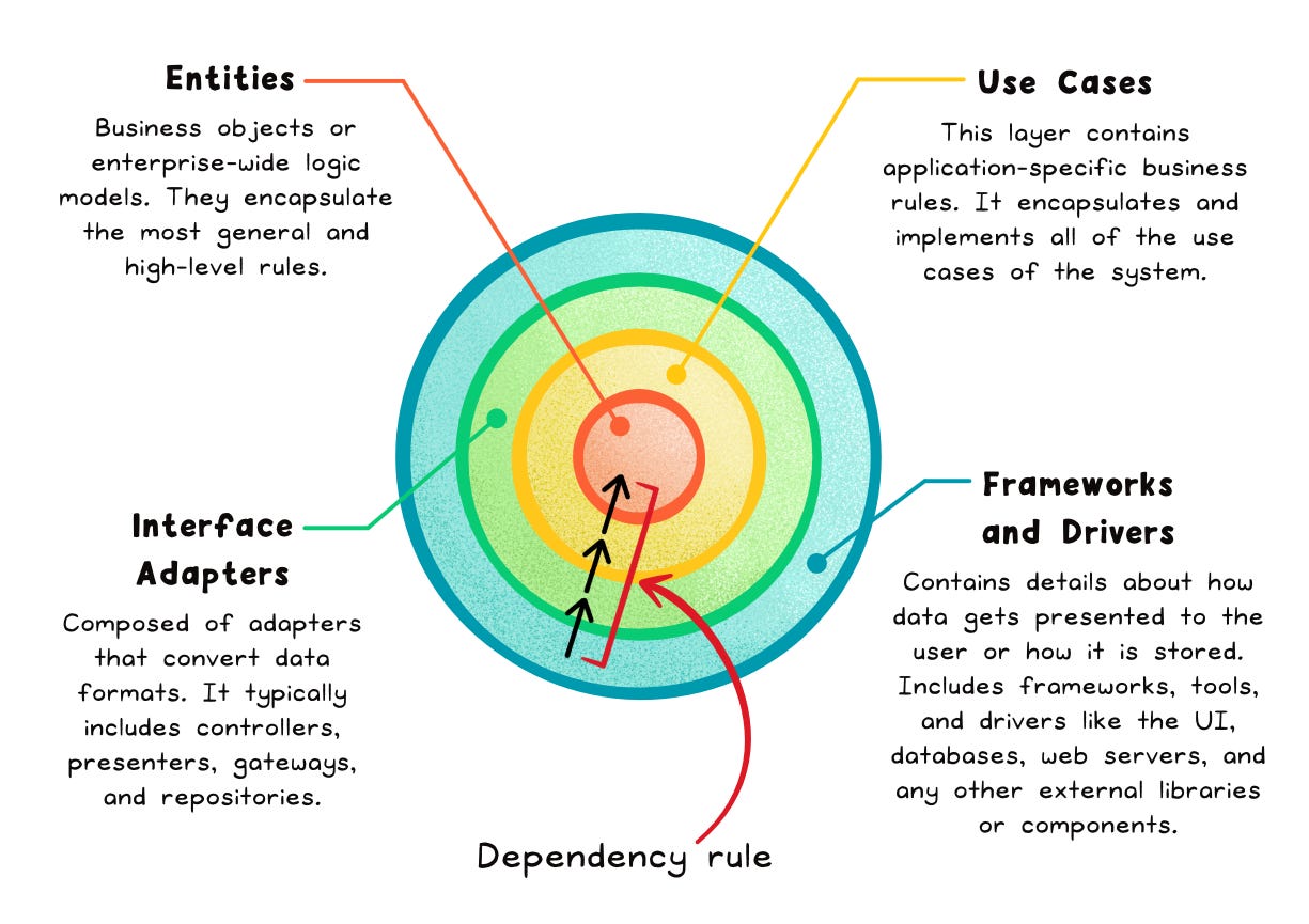 Visually, Clean Architecture can be represented by a series of concentric circles, with each circle symbolizing a distinct layer of software responsibility, delineating clear boundaries between different aspects of the system.
