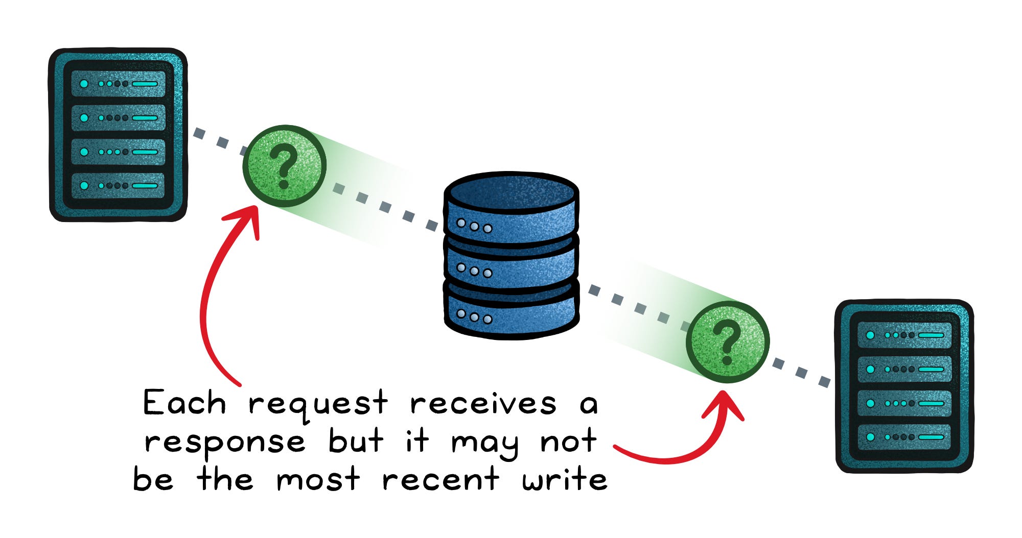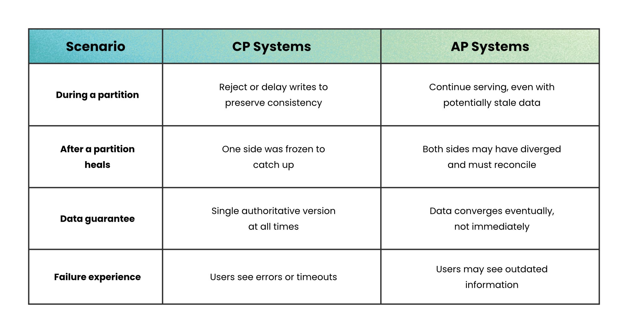 Systems that lean toward Availability + Partition Tolerance (AP) will keep serving requests even when nodes disagree, accepting that some responses may be stale. They’d rather serve something than serve nothing.