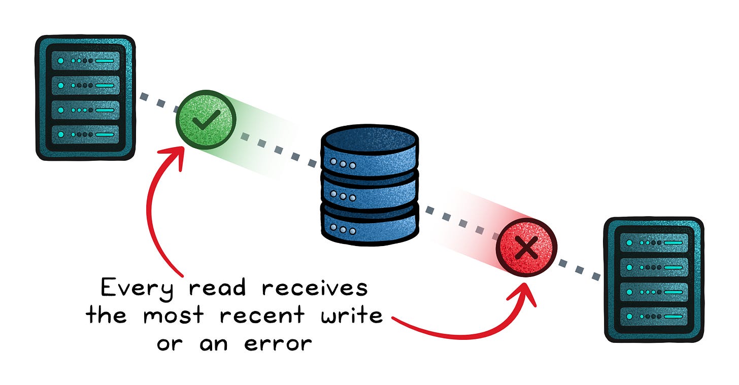 Consistency (C) → Every read returns the most recent write, or an error; never stale data.
