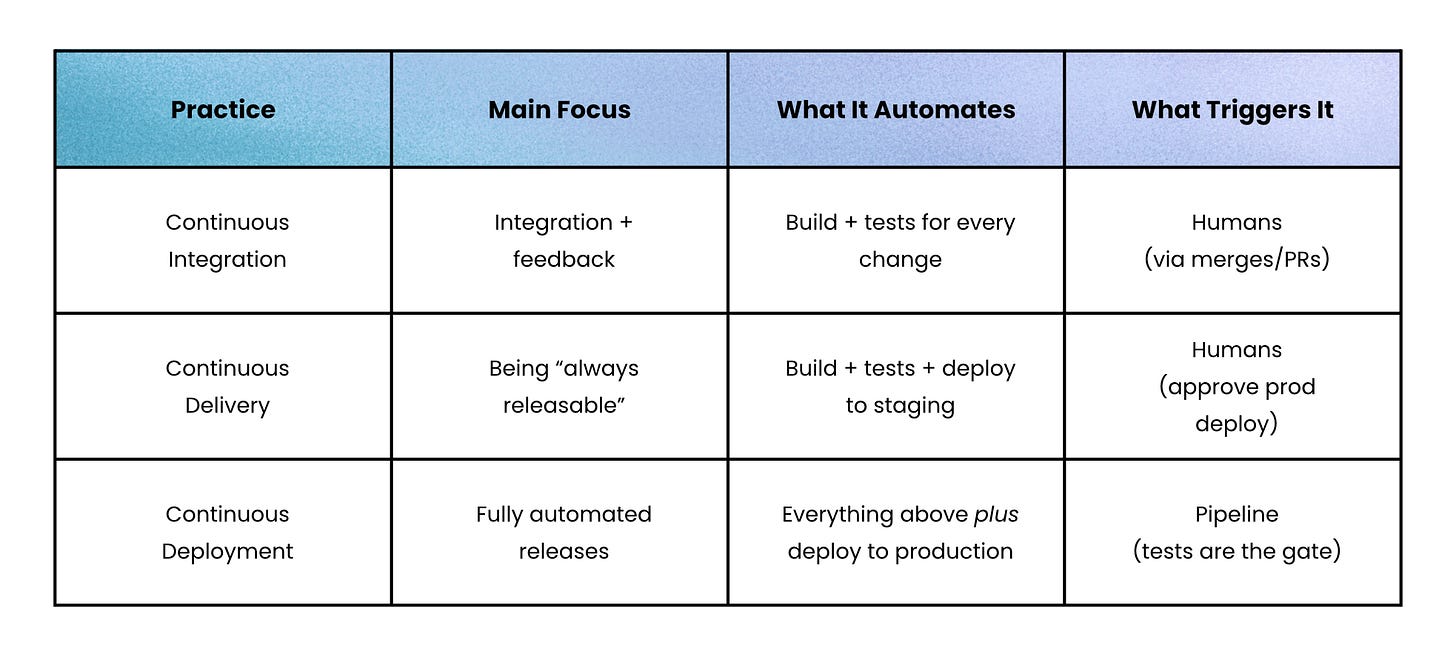Continuous Deployment → Every passing build flows into production without a manual button press, relying on strong tests and monitoring.