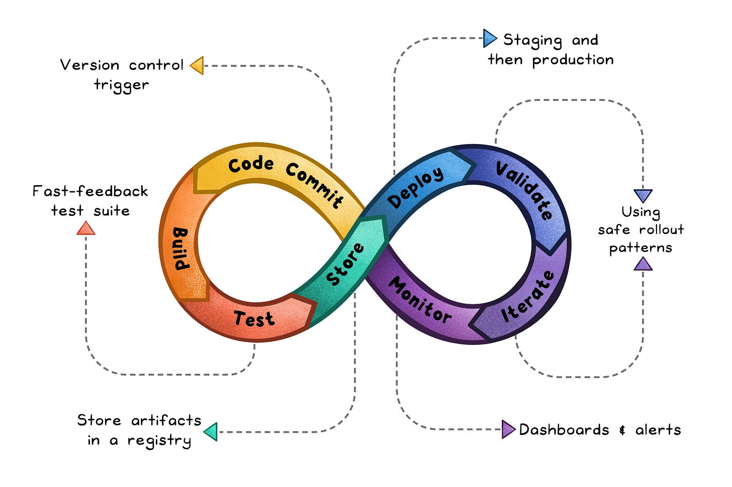 Delivery kicks in:Apply infrastructure-as-code → Spin up or update a staging environment