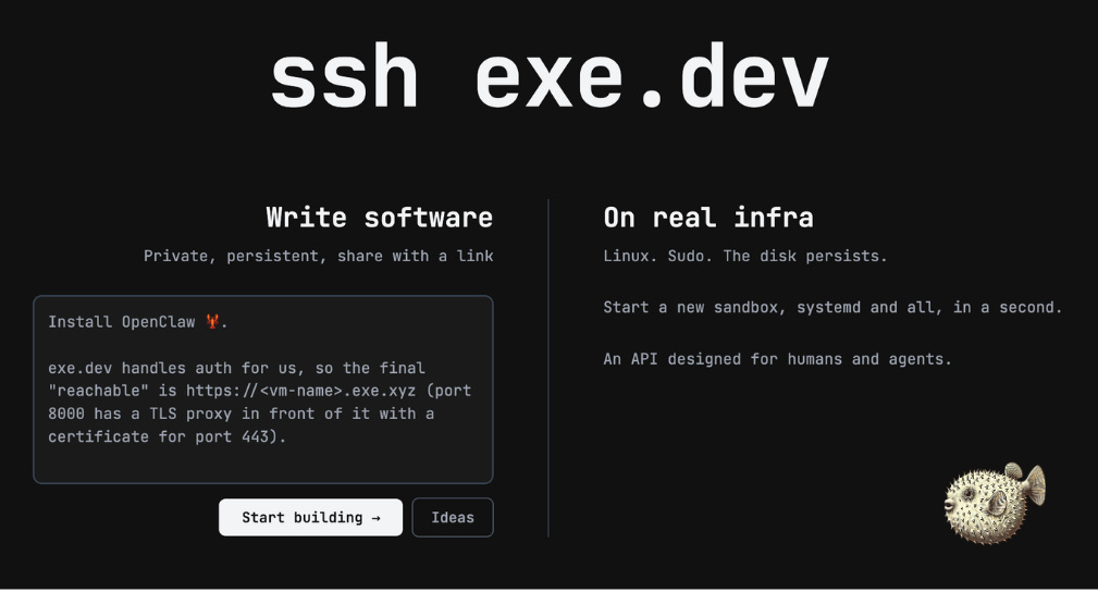Exe.dev gives you instant VMs over SSH. Spin up a full VM in seconds over SSH with built-in HTTPS exposure, persistent storage, and zero cloud configuration. No networking setup, no rebuilding environments, no YAML. Optimized for side projects, internal tools, and AI agents. Start a new sandbox, systemd and all, in a second.
