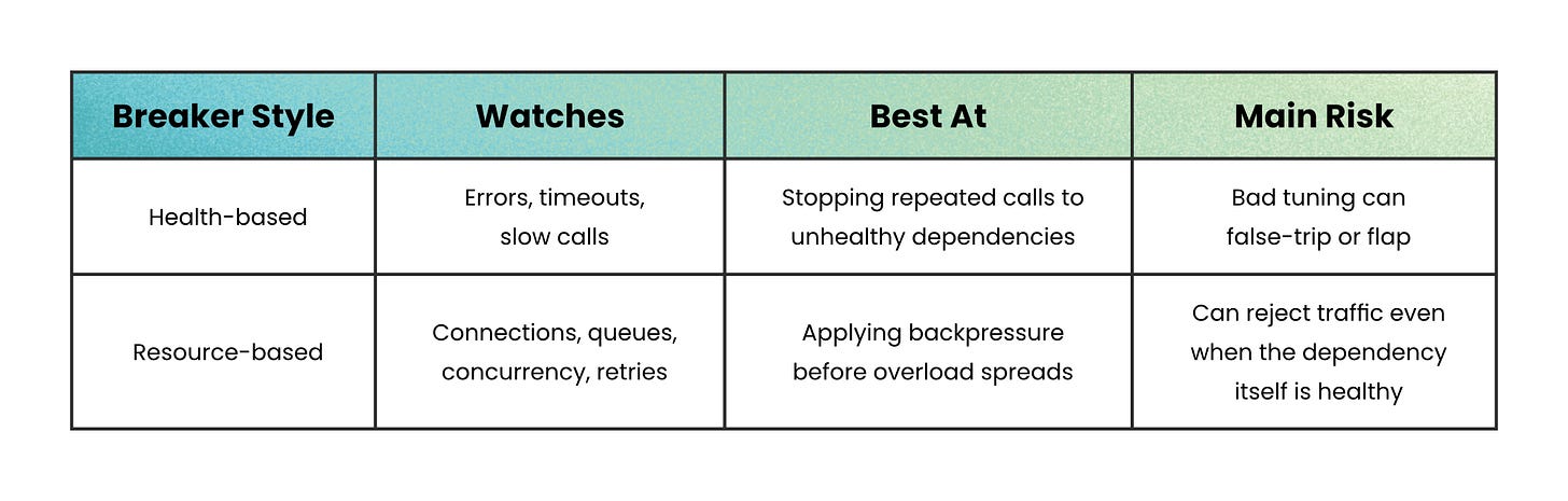 And some proxy or mesh-level breakers focus on capacity rather than health. They trip on too many active requests, pending requests, retries, or connections. These don’t ask whether the dependency is broken. They ask whether the system can safely take more load.
