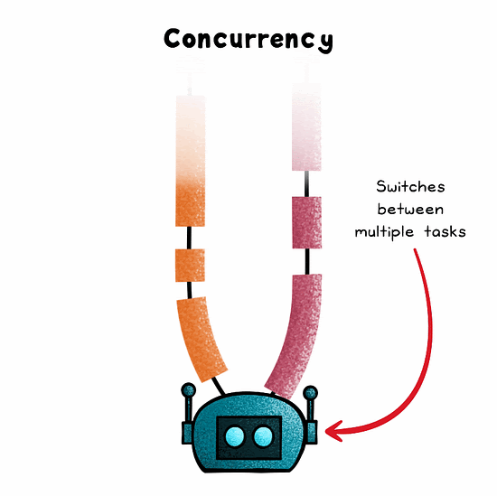 Concurrency structures a system to handle multiple tasks by interleaving them. Even on a single core, a scheduler rapidly switches between tasks—especially useful when tasks involve waiting (eg; I/O operations).