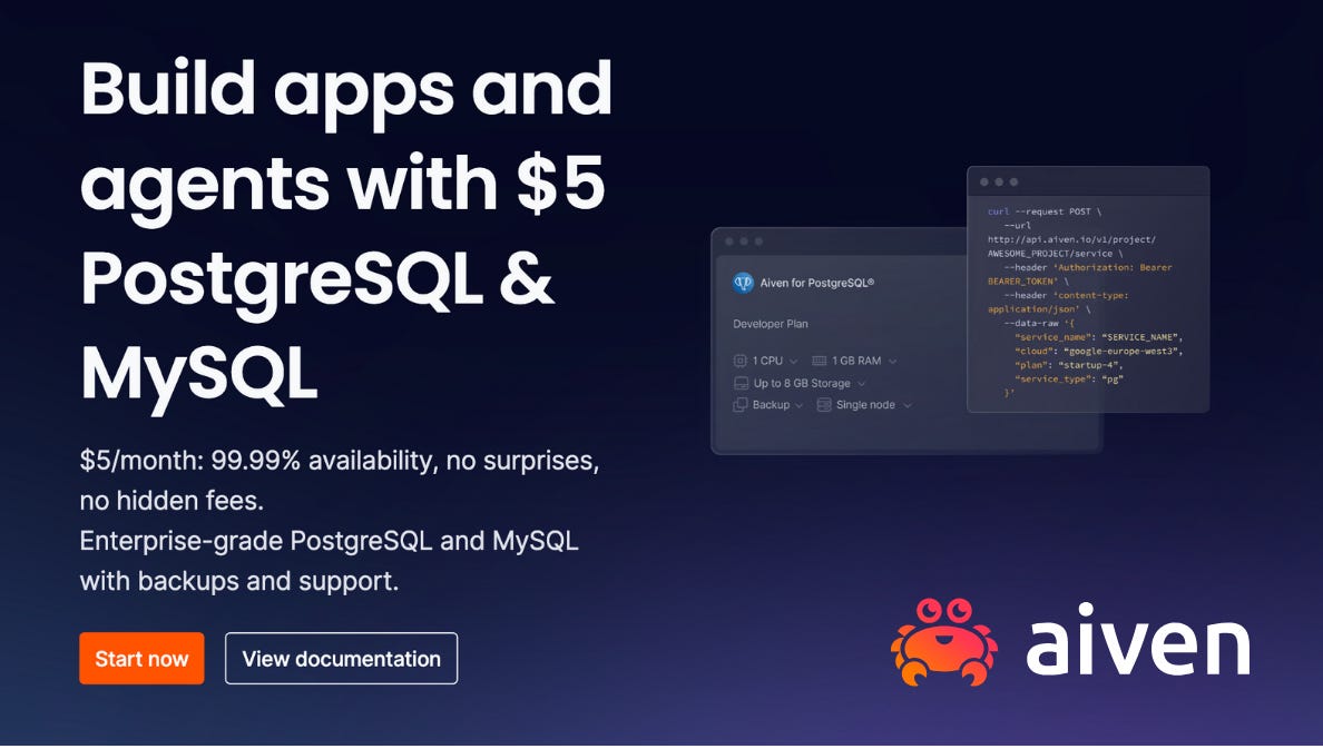 Building side projects, POCs, or agents? Aiven’s new $5 fully managed PostgreSQL Developer tier is an ideal choice. A fully managed database you can spin up instantly. No pricing overkill. No ops tax. Just a real database to practice or test on (without the setup work or fees).