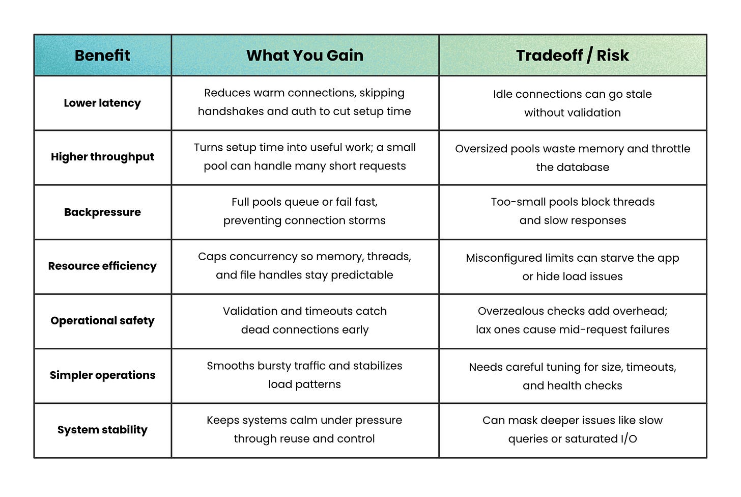Pooling doesn’t eliminate all disadvantages; it shifts it from per-request setup to ongoing coordination.