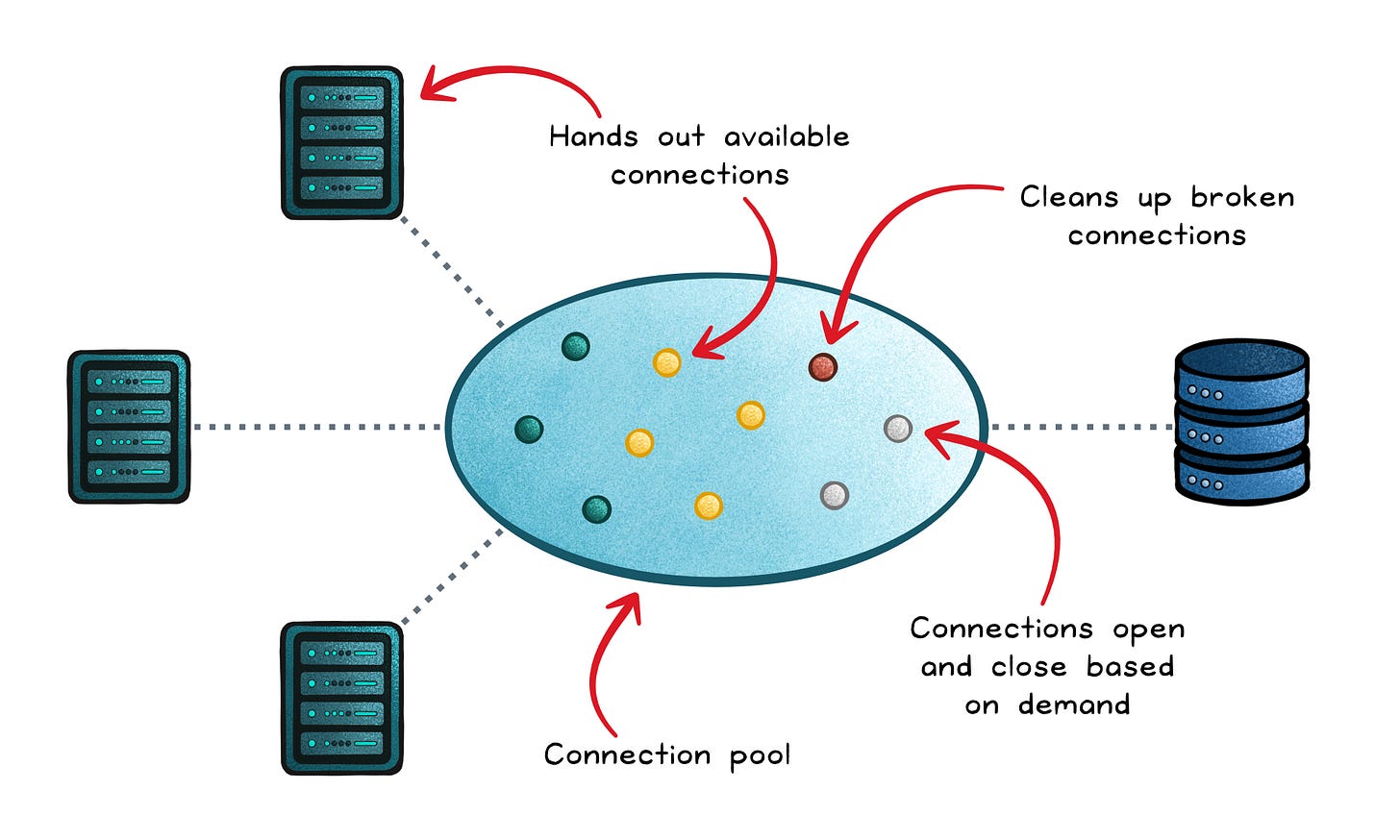 Instead of opening and closing sockets on every query, the pool keeps a managed set of open, ready-to-use connections. When your application needs one, it borrows from the pool; when it’s done, it returns it for reuse.