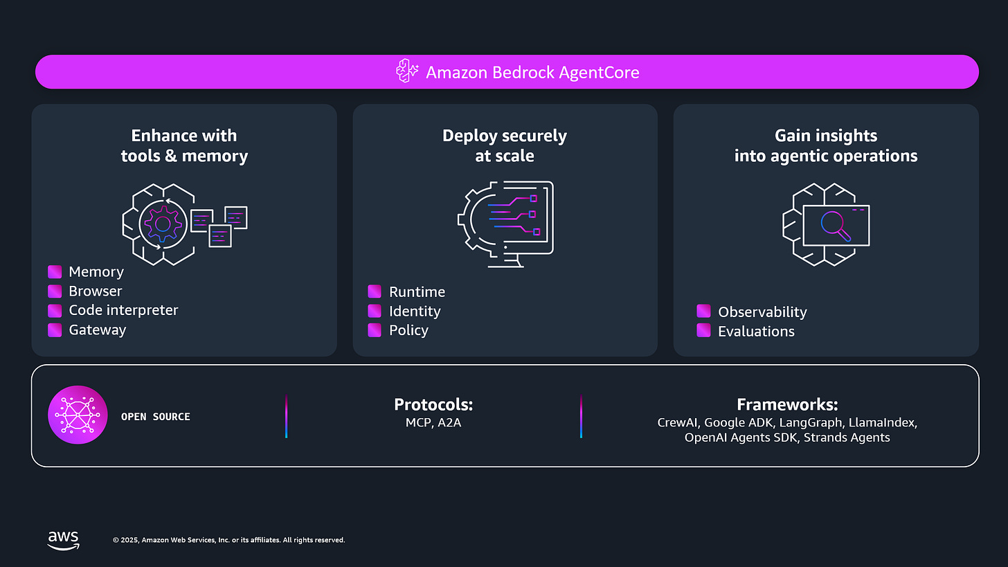Accelerate agents to production with composable services that work with any framework, any model. AgentCore is an agentic platform for building and running production-grade AI agents, securely at scale, with no infrastructure to manage. Now with complete control over agent actions through policies, and continuous evaluations of real-world agent behavior to boost quality.