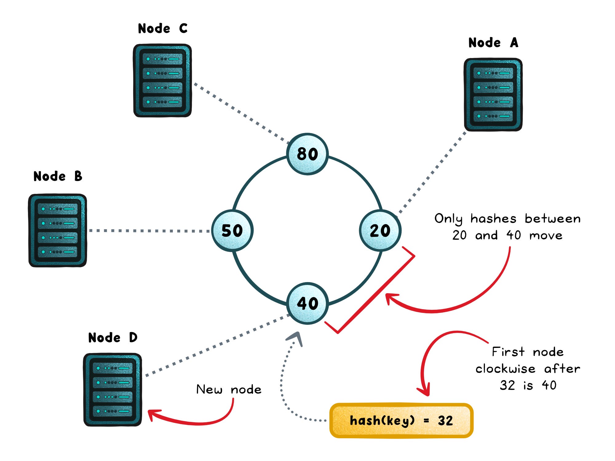 In practice, when a cluster grows, only about 1/N of the keys move; so caches stay warm, rebalancing is light, and new nodes can join without chaos.