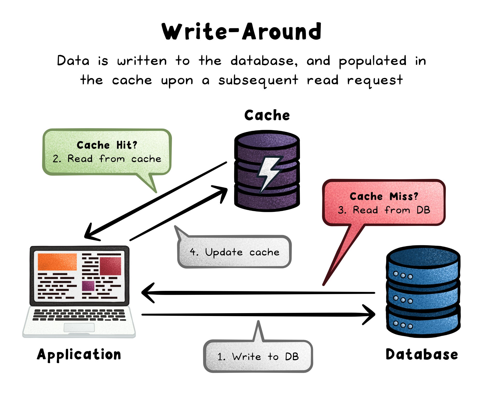 Write-around caching skips the cache during writes, sending data straight to the database.