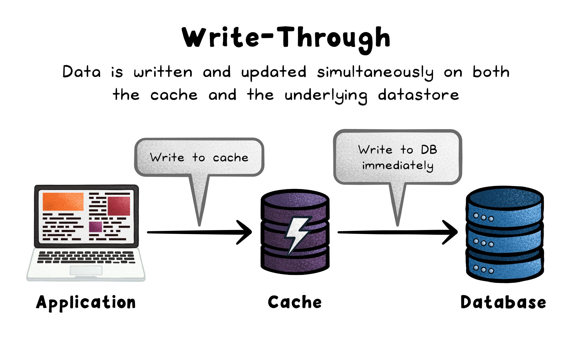 Every write goes through the cache first, which then synchronously persists the change to the database. Reads always hit a warm, up-to-date cache.