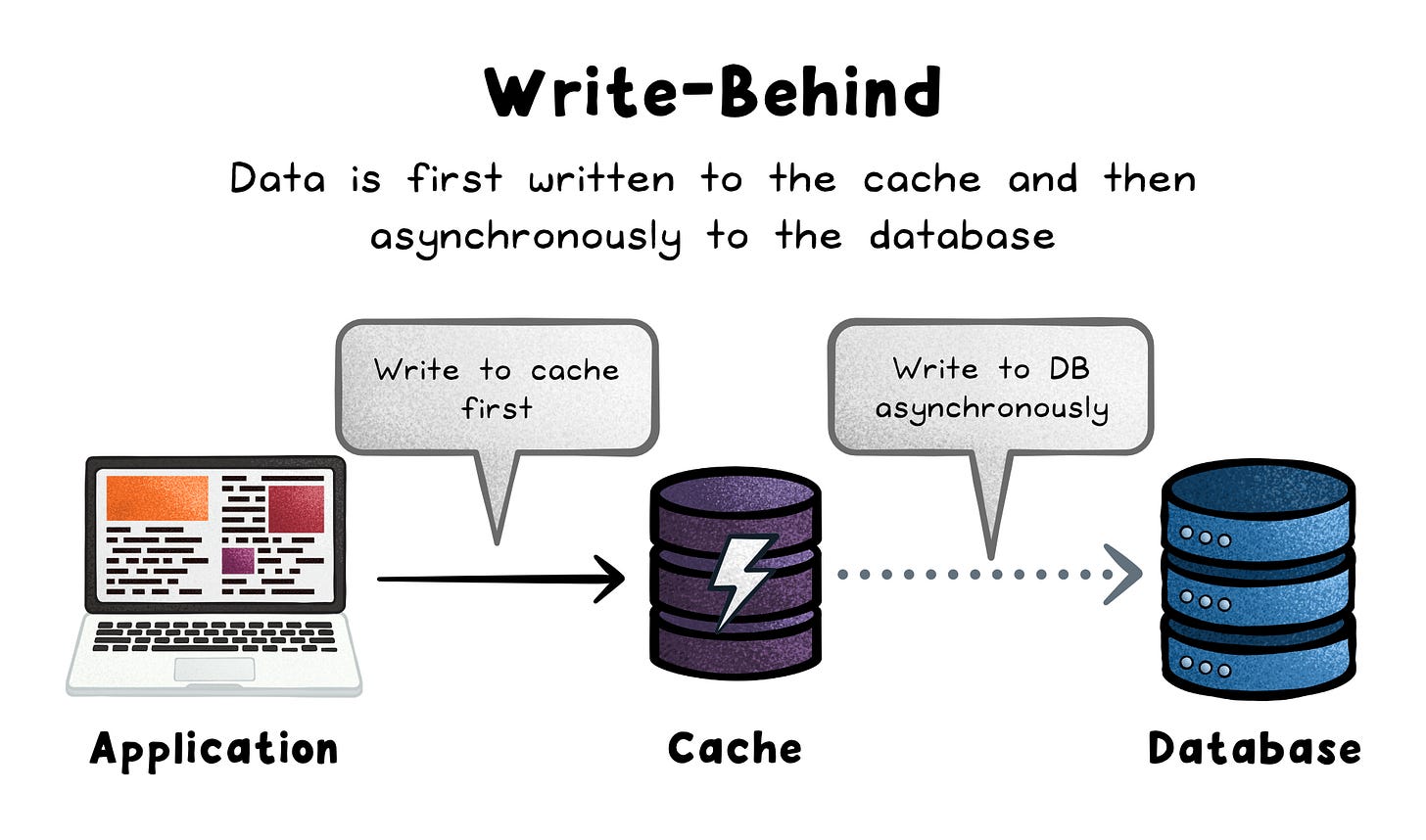 Write-behind (or write-back) caching updates the cache first and the database later in the background. “Dirty” data is flushed based on a schedule or specific triggers like time or batch size.
