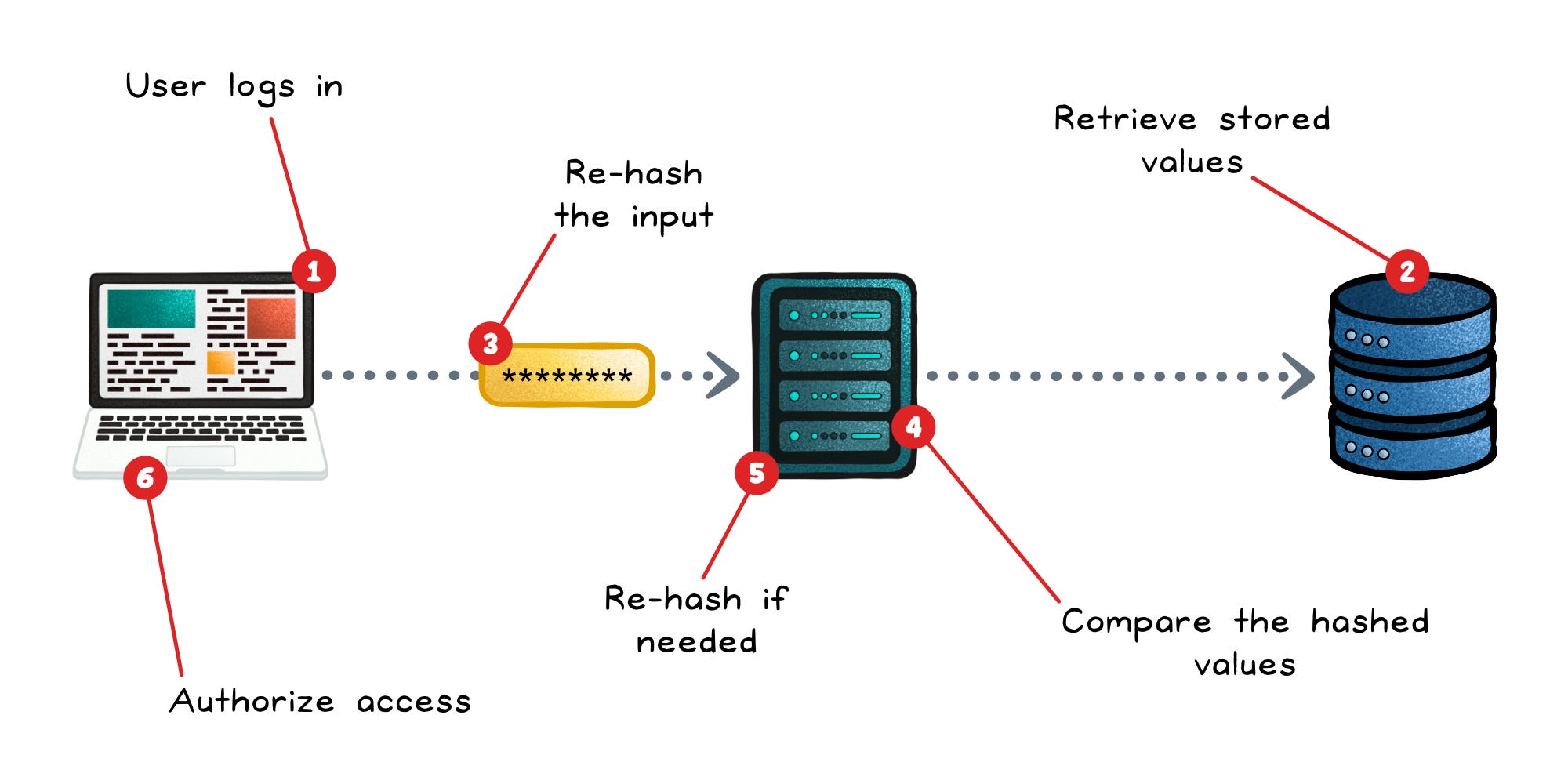 Rehash if needed → If parameters are outdated (for example, fewer iterations, lower memory, or an outdated algorithm), re-hash and update the stored entry after a successful login.