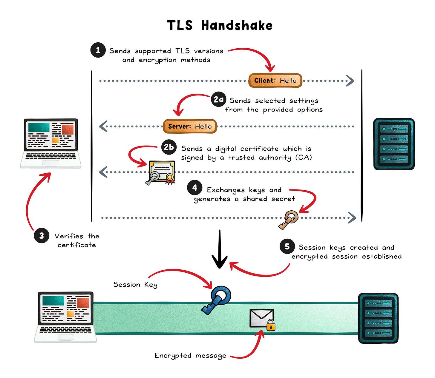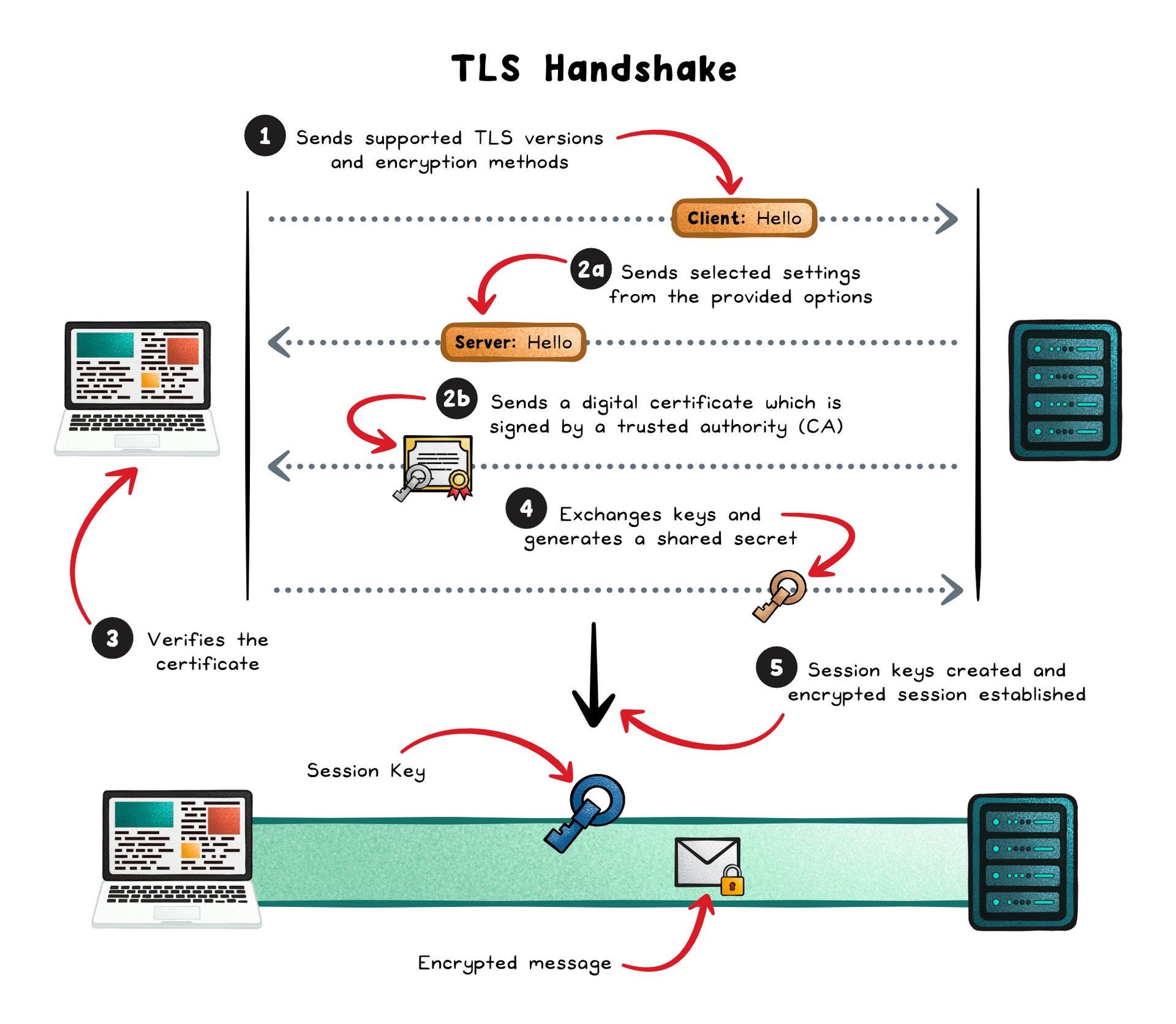 Before any data is exchanged, the browser and server perform a TLS handshake to agree on encryption settings and prove identities. Here’s how it works: