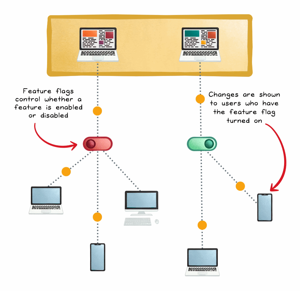 Think of feature flags as on-off switches for new features. They allow teams to deploy features quietly, turning them on for specific users when it makes sense.