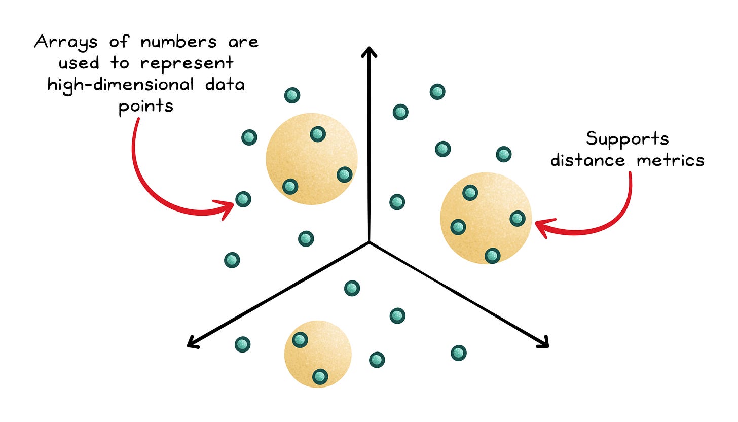 Vector Databases are designed for complex searches and AI-driven applications, utilizing a vector space model to handle high-dimensional data, complex queries and pattern recognition.