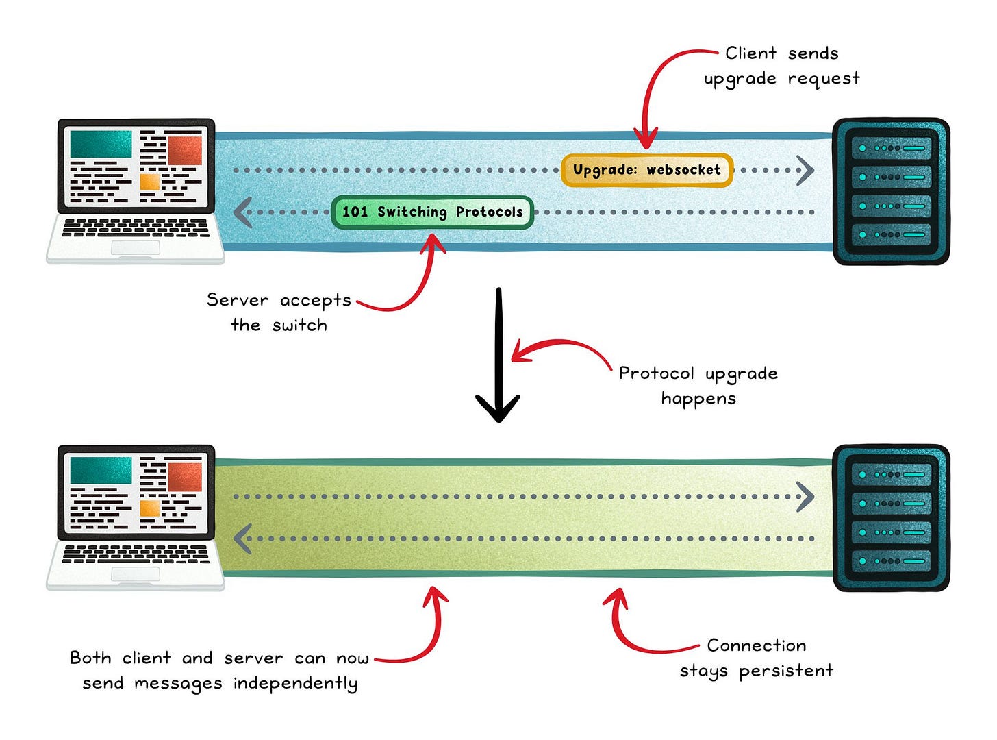 Upgrade: websocketandConnection: Upgradein its request, signaling that it wants to switch from HTTP to WebSocket.Server accepts the switch → If the server supports WebSockets, it responds with a